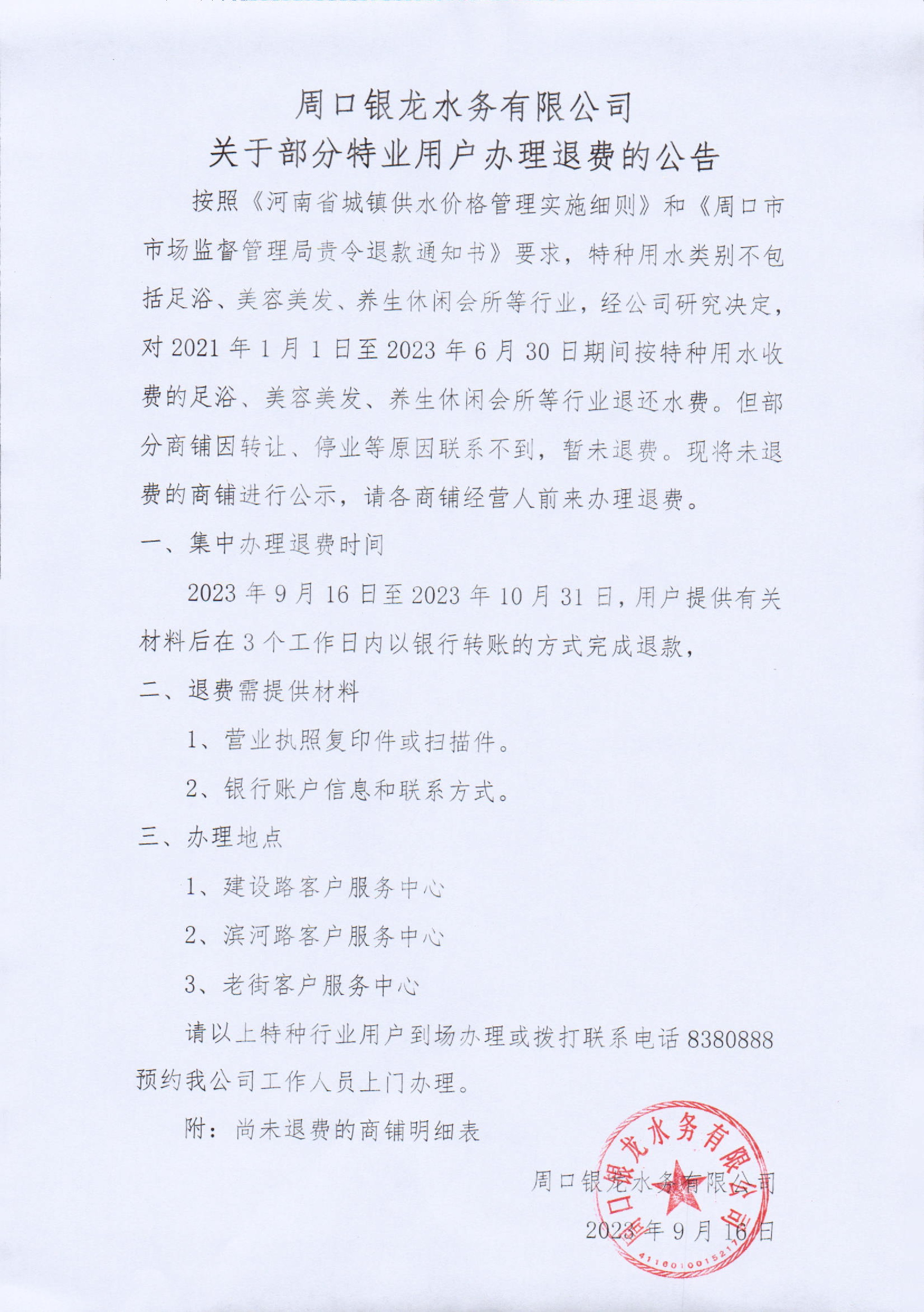 周口銀龍水務(wù)有限公司關(guān)于部分特業(yè)用戶辦理退費的公告按照《河南省城鎮(zhèn)供水價格管理實施細則》和《周口市市場監(jiān)督管理局責(zé)令退款通知書》要求,特種用水類別不包括足浴、美容美發(fā)、養(yǎng)生休閑會所等行業(yè),經(jīng)公司研究決定...